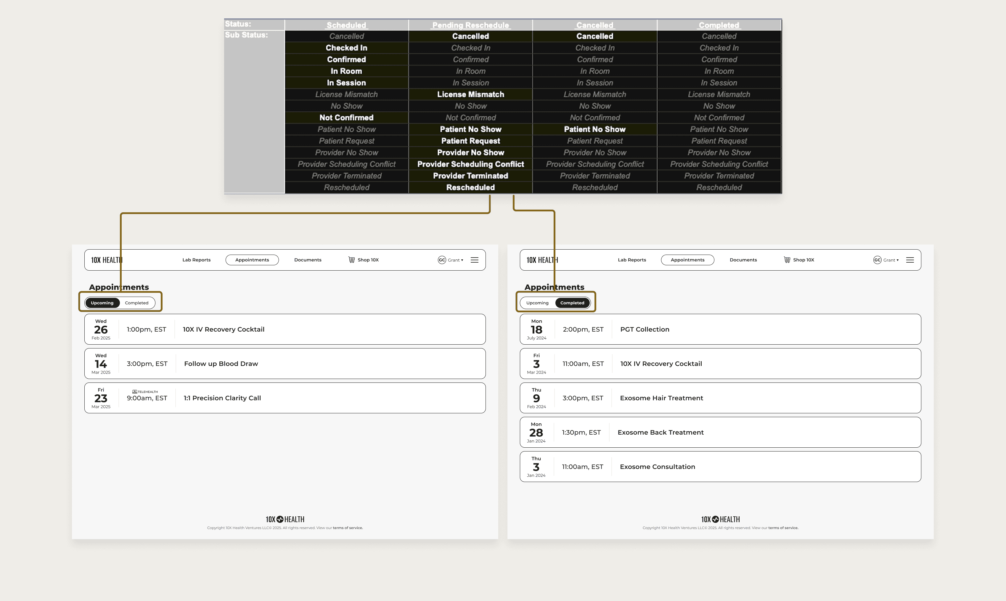 Working alongside stakeholders, we dove into the progression stages an appointment can go through within the EHR. At the end of the day, we wanted to show upcoming and completed appointments. This meant translating many internal statuses to delegate the appointment in one of those two categories.